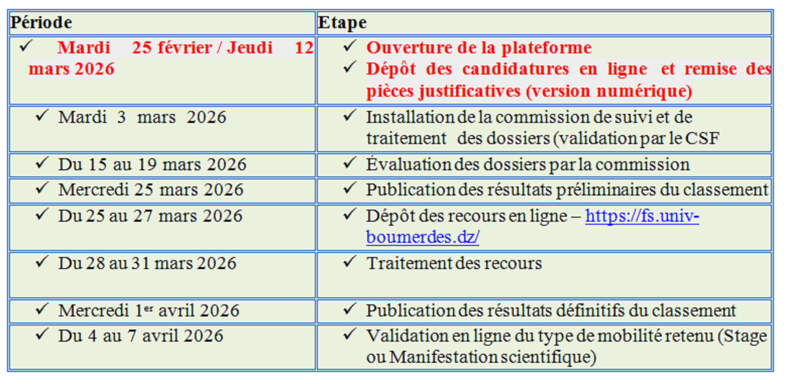 – Candidats ayant bénéficié d’une mobilité au cours de l’année 2025 : le bilan doit couvrir la période allant du 2 février 2025 au 28 février 2026.