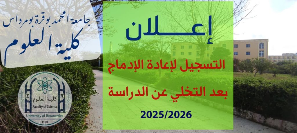 نهي كلية العلوم إلى علم الطلبة المنقطعين أو المتخلين عن الدراسة أنه تم فتح فترة إيداع ملفات طلبات إعادة الإدماج للالتحاق بالتكوين في طوري الليسانس و الماستر للموسم الجامعي 2026/2025 عبر الرابط التالي
